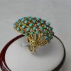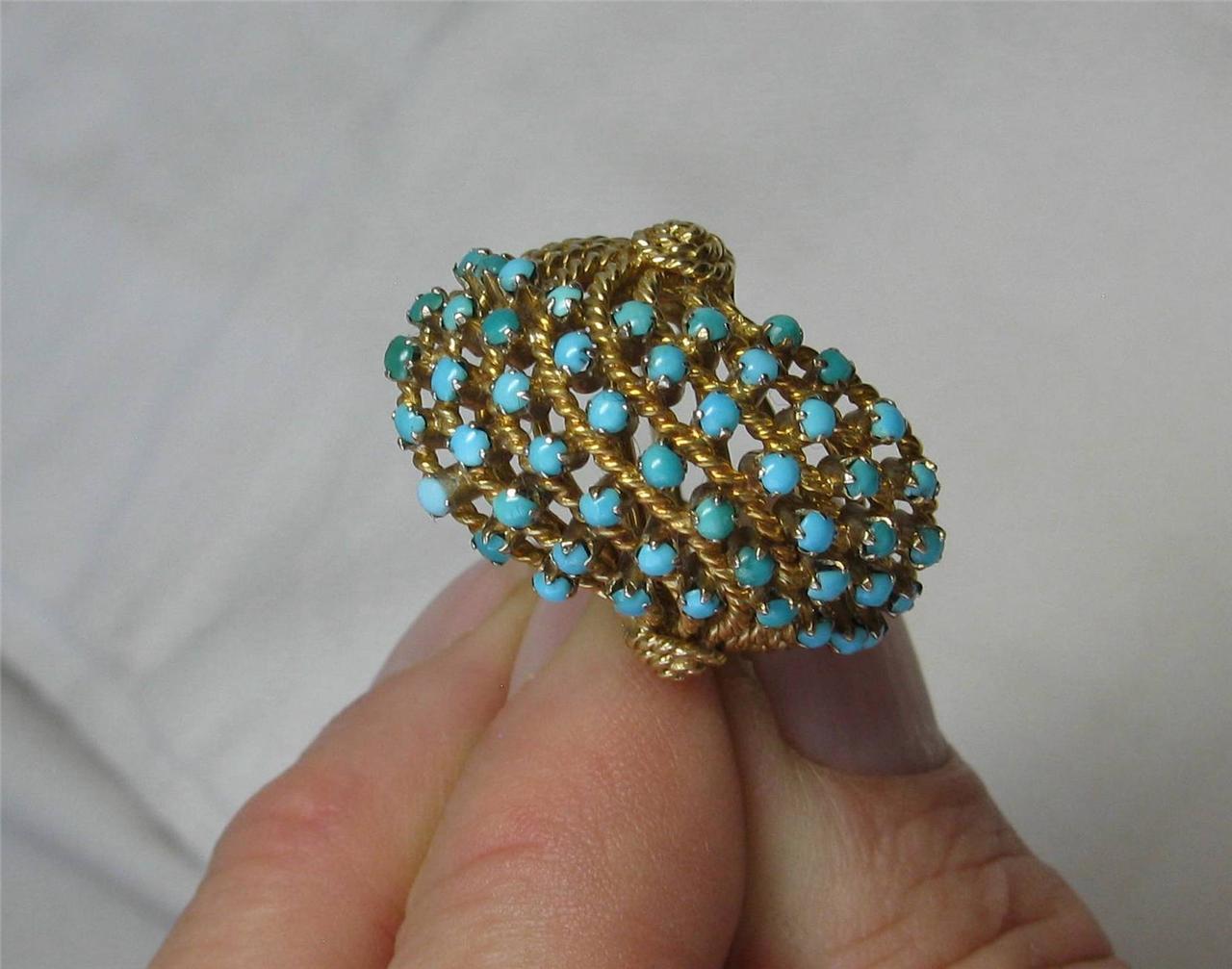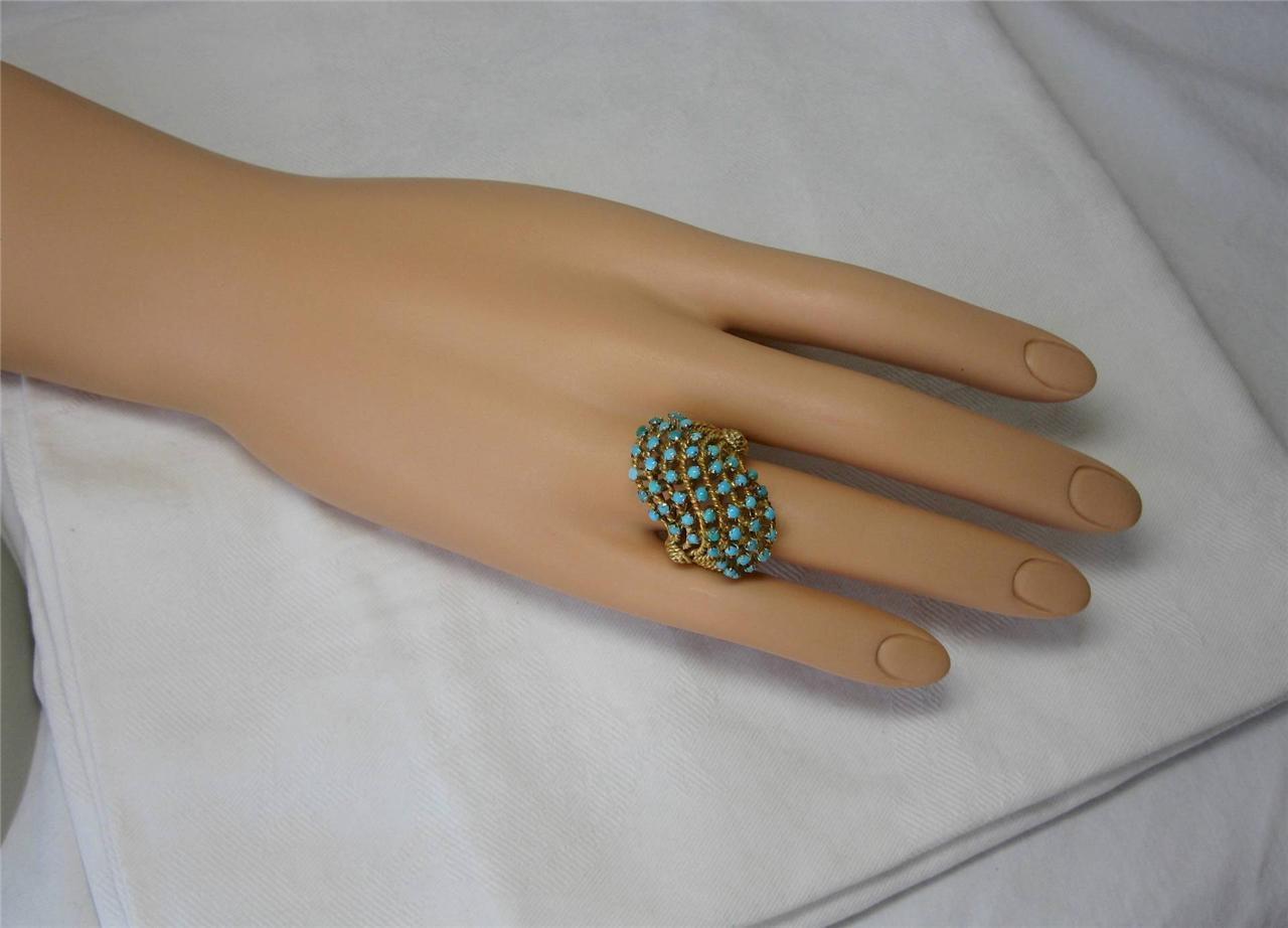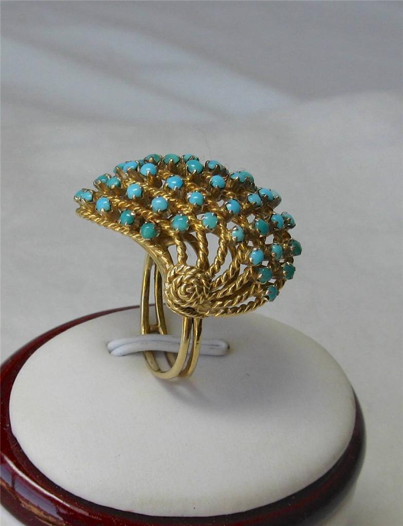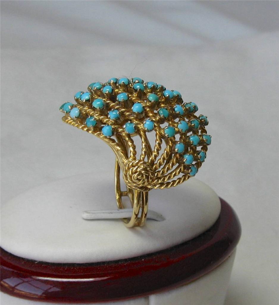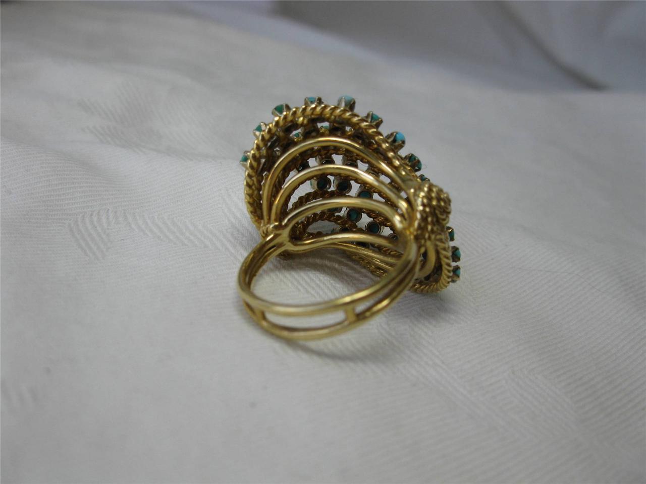 The ring is adorned with 49 of the most stunning carved Persian turquoise cabochons! The natural mined Persian Turquoise cabochons are just elegant. Turquoise is all the rage today and please see the pictures below from Veranda with the prices – a simple Turquoise ring for over $9000.00! This ring is a stunning example. The gems are set in a 14K yellow gold mid-century modernist design with a shell and braided motif set with 7 rows of 7 turquoise. It is a real treasure!!